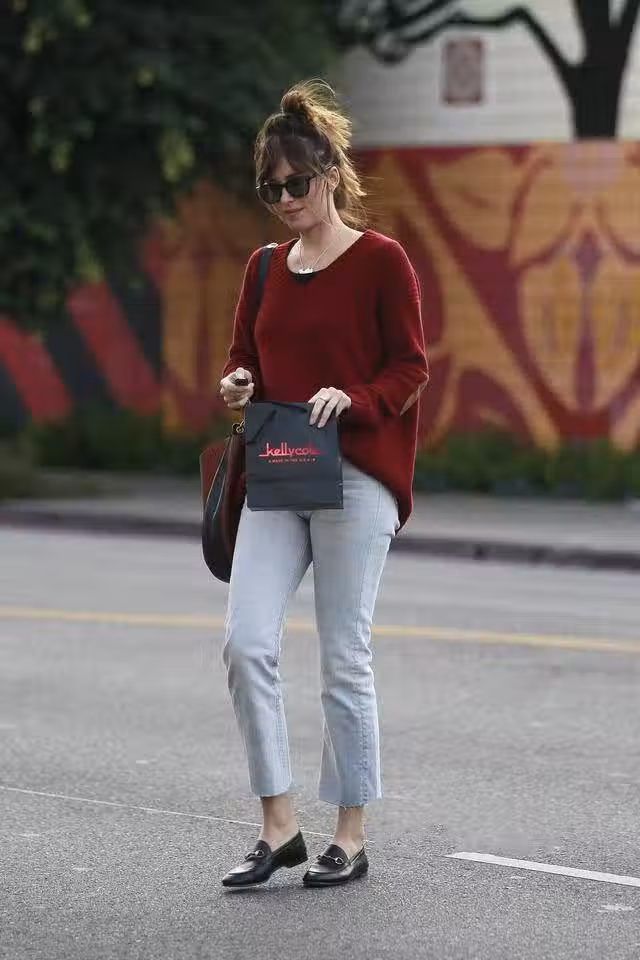 純凈的單寧牛仔褲在上了年紀的女人身上是最常用的,不過對於年輕有朝氣的女孩子來說,選擇有做舊、磨破、流蘇、破洞、金屬裝飾等搖滾氣息的牛仔褲搭配雞蛋鞋再好不過。比如下圖這樣的牛油果綠毛衣搭配持續和有金屬裝飾的牛仔褲,在配高筒襪和牛紅色雞蛋鞋,看起來就很酷很有活力,喜歡朋克風或者韓風的女生,多用一些潮流的配飾和元素加在牛仔褲上,於雞蛋鞋也是絕配。