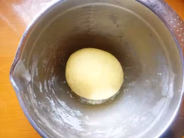 3、揉面板上撒少許玉米澱粉防粘,把鬆弛好的麵糰放在揉面板上,擀成2毫米厚的片狀。