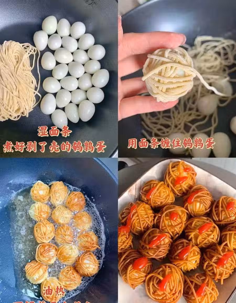 面條在鵪鶉蛋上面纏成一個圓形就可以了。