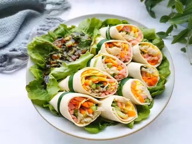 主要食材:豆腐皮1張,金針菇1把,胡蘿蔔半根,黃瓜1根,雞蛋1個,午餐肉2片,韭菜3根,香菜2根,醬油1勺,米醋1勺,蚝油半勺,黃豆醬1勺,辣椒油1茶匙。