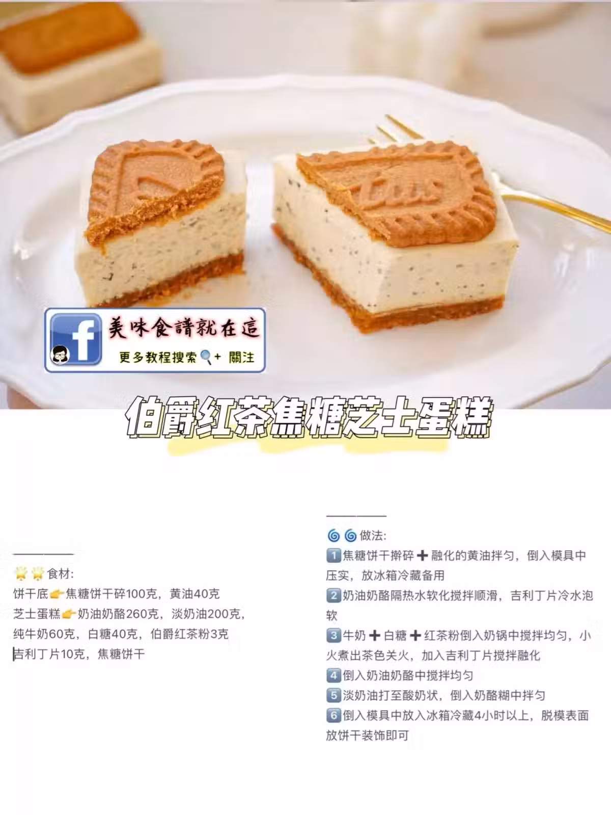 芝士蛋糕👉奶油奶酪260克,淡奶油200克,純牛奶60克,白糖40克,伯爵紅茶粉3克·吉利丁片10克,焦糖餅乾