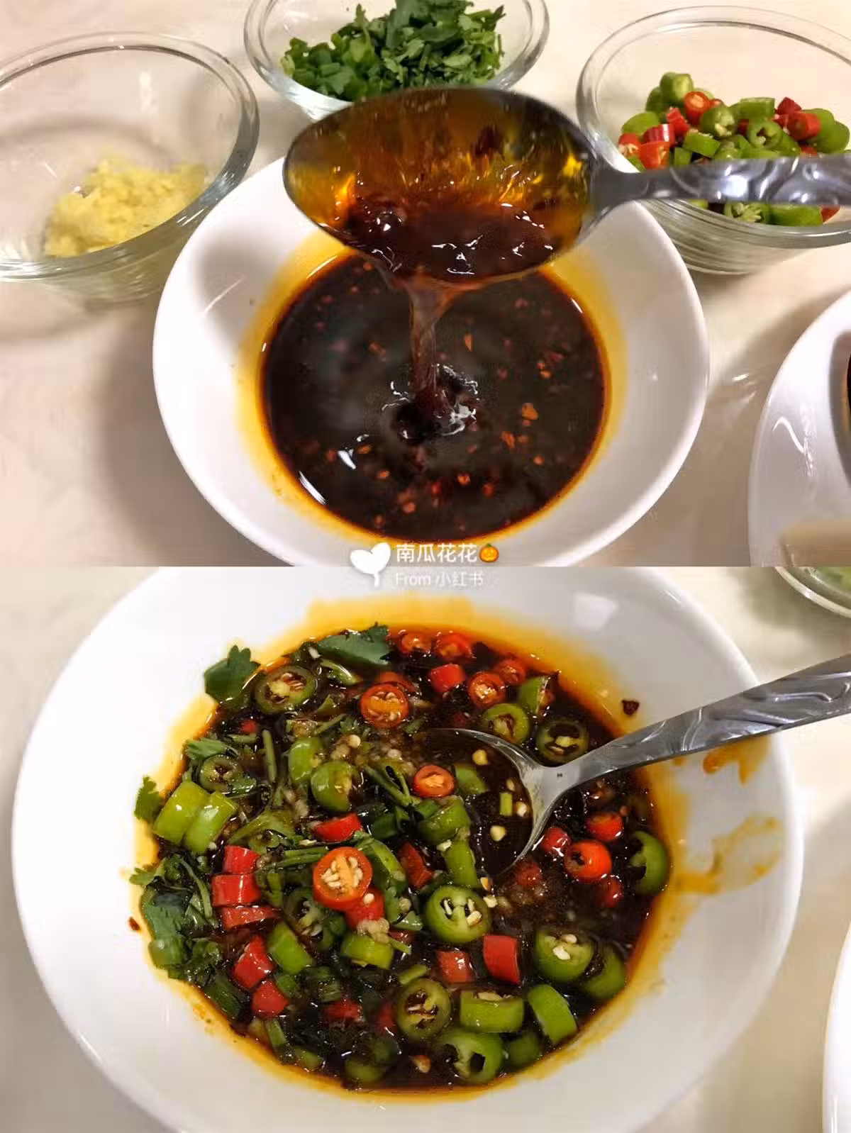 4️⃣ 醬汁中再加上:小米辣圈、青線椒圈、香菜末、蒜末、蔥花,攪拌均勻。