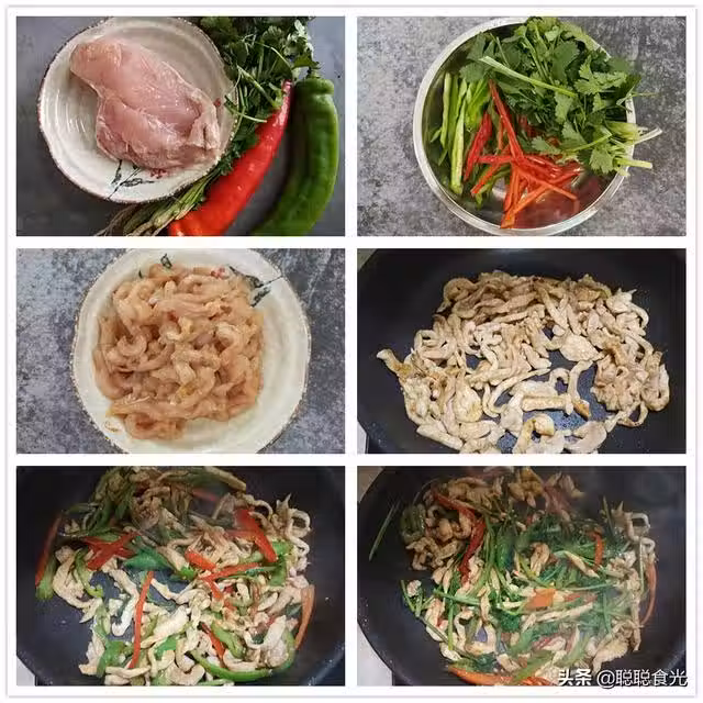5、炒到雞絲顏色變白,放入紅綠辣椒絲炒軟,最後放入香菜絲,進入適量生抽,炒均勻就可以了。