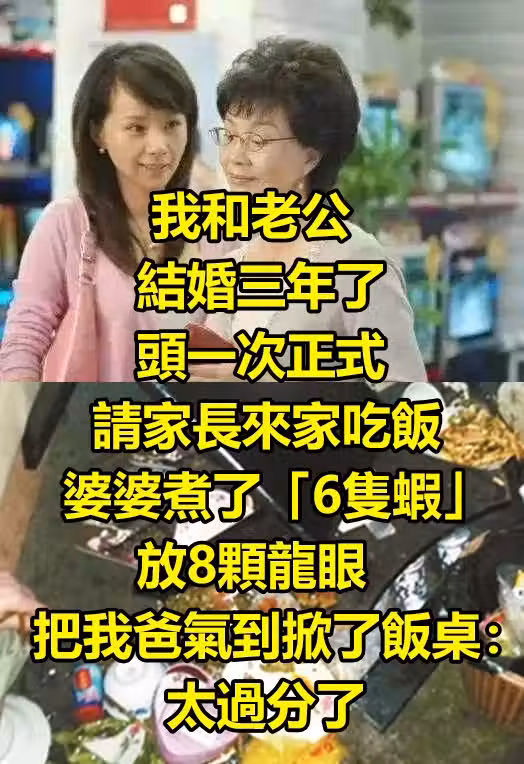 我和老公結婚三年了,頭一次正式請家長來家吃飯。婆婆煮了「6隻蝦」放8顆龍眼,把我爸氣到掀了飯桌:太過分了!