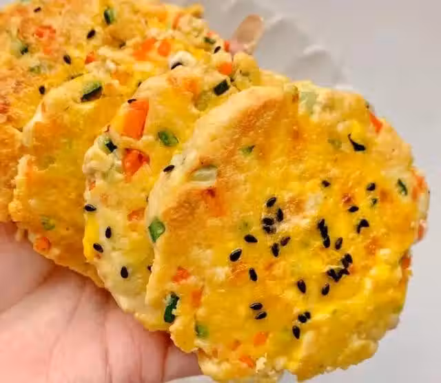2、加半勺鹽和一勺生抽調味,捏成小圓餅放入平底鍋煎至定型,表面刷蛋液、灑點黑芝麻點綴