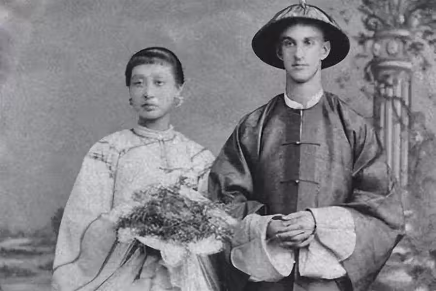這個洋人竟然穿著清朝官員的衣服, 看兩人親昵的姿態,兩人應該是夫妻關系,妻子應該是中國人,也不知道這個人在當時是什麼樣的職位。