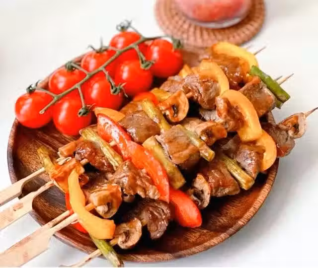 按照喜好將牛排,彩椒,口蘑,蘆筍穿串。