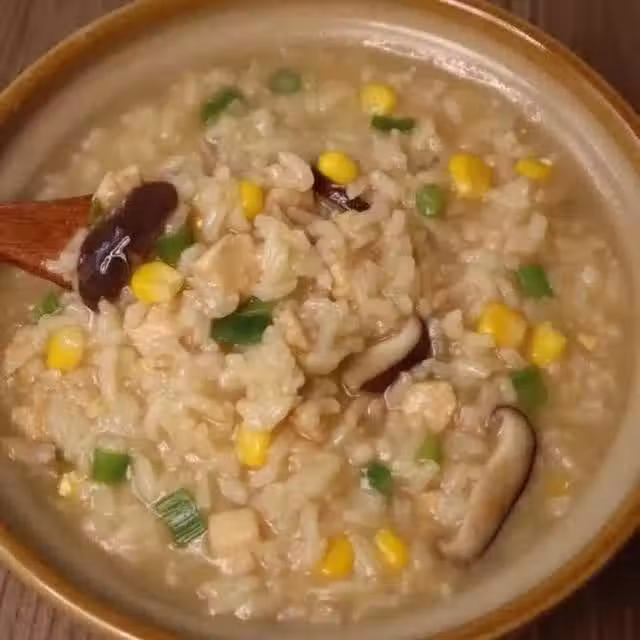 鍋中熱油倒入雞肉翻炒變色,加胡蘿蔔碎、香菇碎翻炒,加提前煮好的大米粥,煮5分鐘