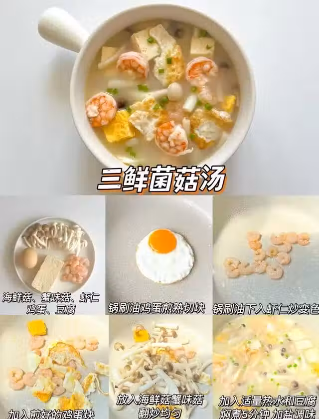 食材:蝦仁、海鮮菇、蟹味菇、雞蛋、豆腐
