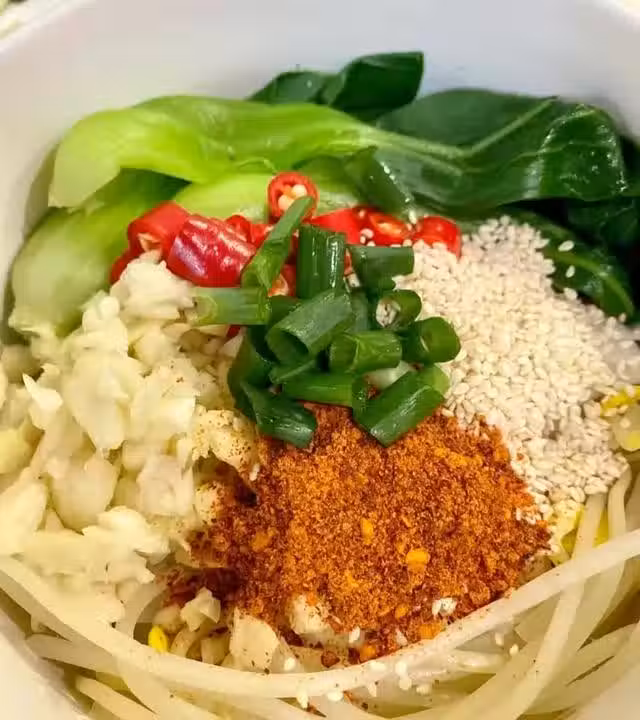 2.麵條上加上蒜末十小米辣椒十香辣蘸料十白芝麻十蔥花,之後再淋上熱油就可以了。