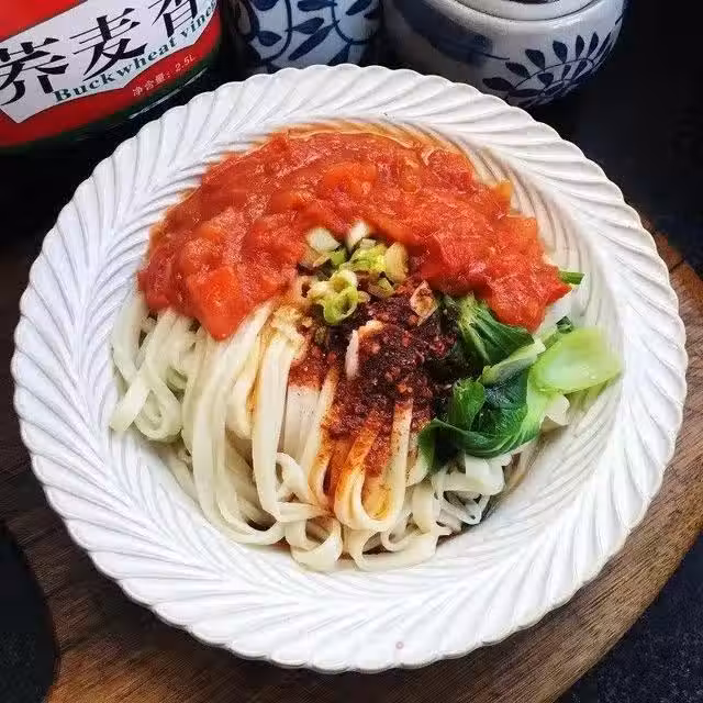 麵條中加辣椒粉,蔥花,用熱油淋入激出香味兒,放入茄汁,鹽,醋,醬油,食用時攪拌均勻即可。