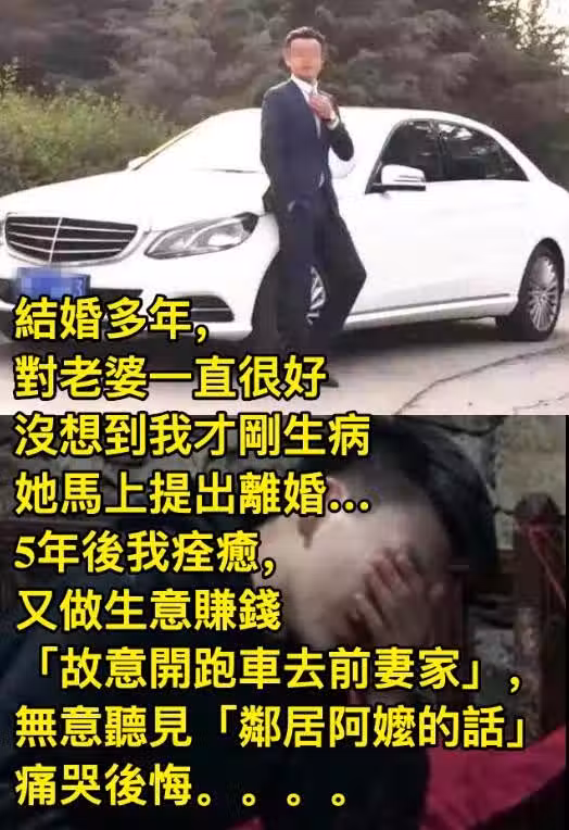結婚多年,對老婆一直很好,沒想到我才剛生病,她馬上提出失婚…5年後我痊癒,又做生意賺錢「故意開跑車去前妻家」,無意聽見「鄰居阿嬤的話」痛哭後悔!