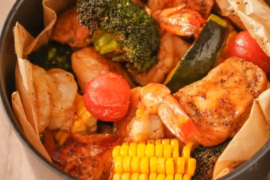 食材:蘑菇、番茄、玉米、南瓜、西蘭花、雞胸肉、蝦仁