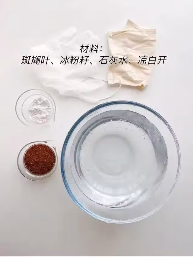 1、80g斑斕葉洗凈後加少許小蘇打,煮幾分鐘濾出,洗凈後加800g涼白開打成斑斕汁,過濾備用。
