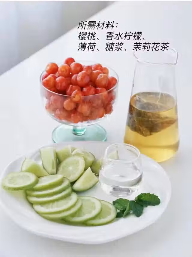 櫻桃洗凈後去核,香水檸檬分成兩半,半個切成檸檬角、半個切成檸檬片