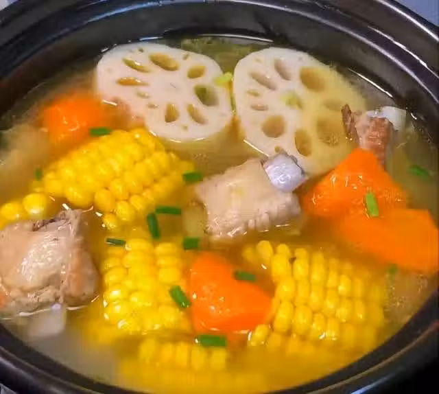2.鍋中熱油,蔥姜爆香,排骨放入鍋中煎至兩面金黃,倒入開水沒過排骨,加蓮藕,胡蘿蔔,玉米蓋上蓋子燉 30/40分鐘