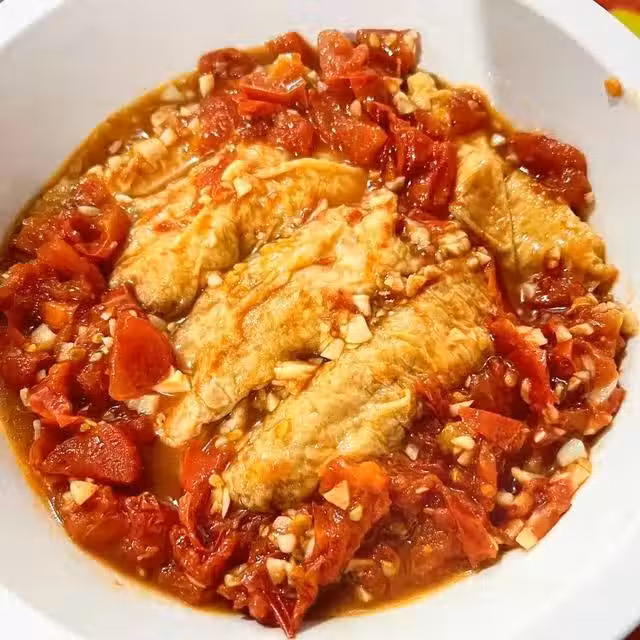 4、油熱下蒜末炒香,然後下入番茄丁,開小火炒出汁水。加少量水,煮濃稠即可。