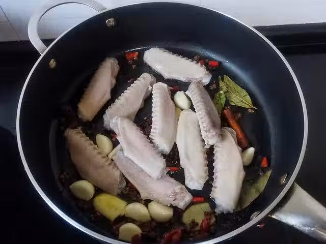6、待鴨翅中炒至兩面略微焦黃後,加入柱候醬、紅油豆瓣醬、生抽、老抽、細砂糖、鹽和十三香粉,翻炒至上色均勻