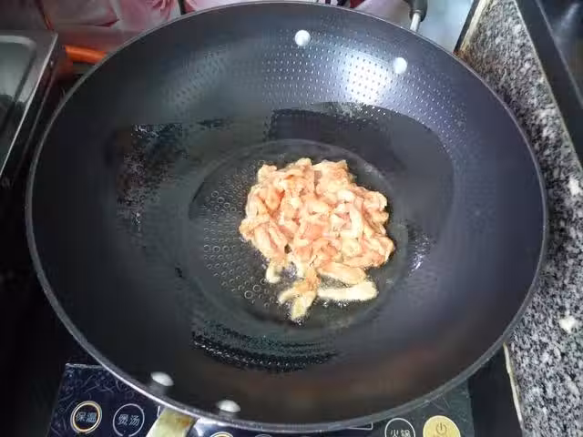 6、加入切好的胡蘿蔔絲和蒜片,翻炒1分鐘。