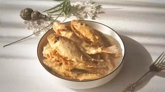 4.油燒至7成熱時,放入小黃魚。小火炸至金黃撈出。再次升高油溫,把魚再復炸一遍,逼出多餘的油份,也使魚更酥脆。