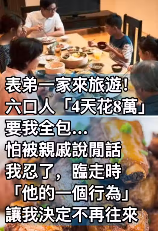 表弟一家來旅遊!六口人「4天花8萬」要我全包…怕被親戚說閒話我忍了,臨走時「他的一個行為」讓我決定不再往來