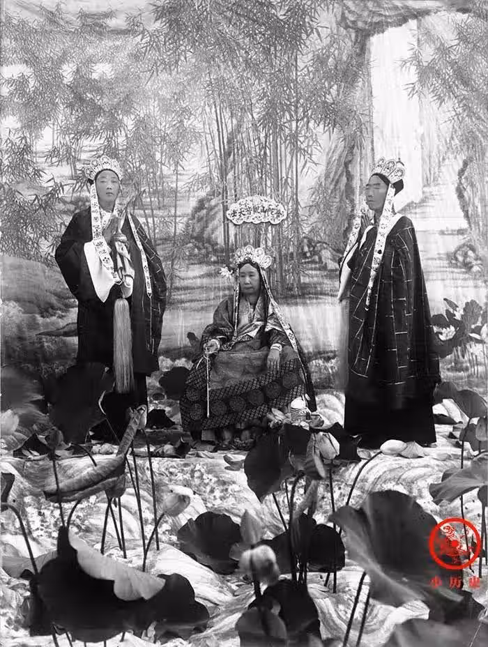 慈禧太后有扮演普陀山觀音大士的愛好,因為這樣能使她看上去更加慈祥。1903年她接觸照相機之後,就讓人把這一幕拍攝了下來。太后身邊站了兩位護法,均由她寵信的大太監扮演,左為崔玉貴,右為李蓮英。