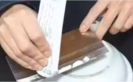 第二步:把牙膏塗抹在菜刀的刀刃上,刀兩邊都要塗抹上,塗抹好之後就可以直接磨菜刀了。把菜刀稍微傾斜一點放在瓷碗上,然後朝同一個方向摩擦菜刀就可以了。