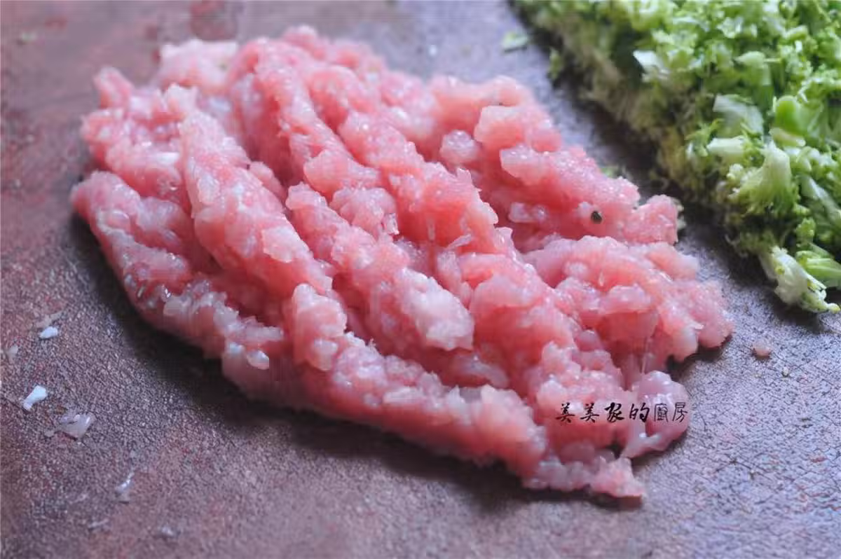 豬肉剁成碎末,可以用五花肉吃起來更香,但是用純瘦肉會更健康。