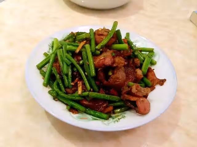 2.香腸切片,鍋中油熱後,放入薑絲、干辣椒炒香。倒入香腸,翻炒均勻。