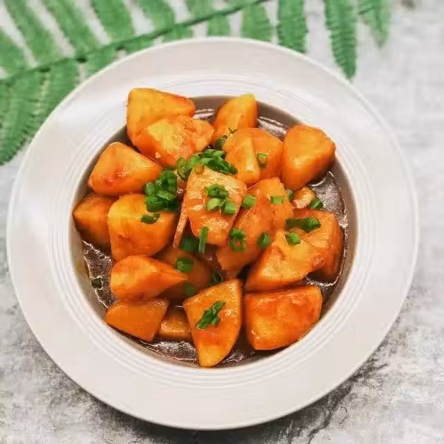 4.待湯汁收至一半後,倒入水澱粉勾芡;淋上香油,紅燒土豆就出鍋了。土豆軟爛酥香非常入味。