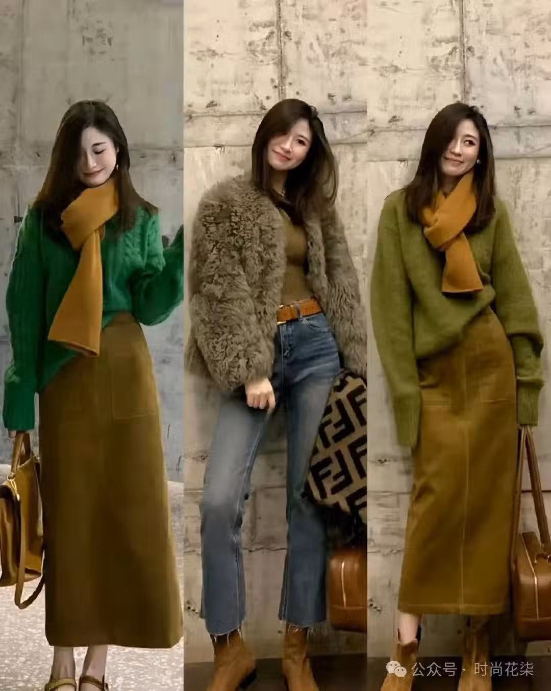 森林綠色的粗線毛衣,帶著些復古的腔調,搭配焦糖色的長裙,配色時髦好看,顯得人格外青春。