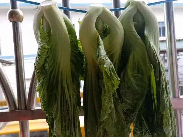 3,燒一鍋開水,把曬癟的芥菜放入開水中,燙5~10秒。撈出晾涼瀝水。