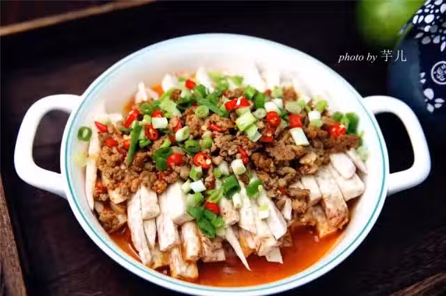 5.將腌好的芋頭條擺放在盤子裡,再將爛肉臊子舀到芋頭面上。