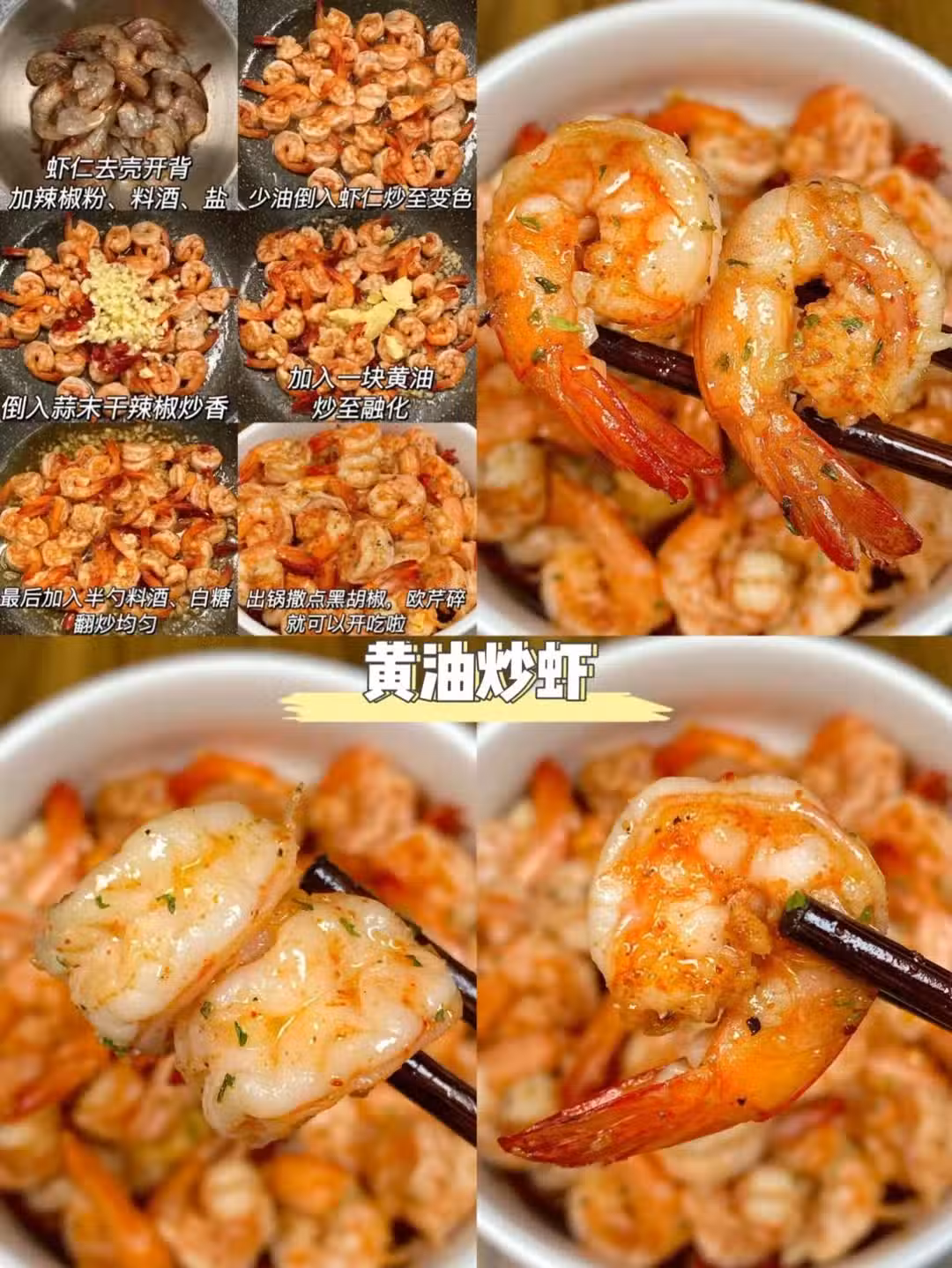 黃油炒蝦是一道簡單美味的海鮮菜。先將蝦去殼洗凈,備用。熱鍋冷油,下黃油融化後加入蒜末,炒出香味。然後倒入蝦仁,翻炒至蝦仁變色,加入少許鹽、白酒(或料酒)、黑胡椒粉提味。炒至蝦仁完全熟透後,撒上些許的蔥花或香草碎點綴,即成一道香濃誘人的黃油炒蝦。