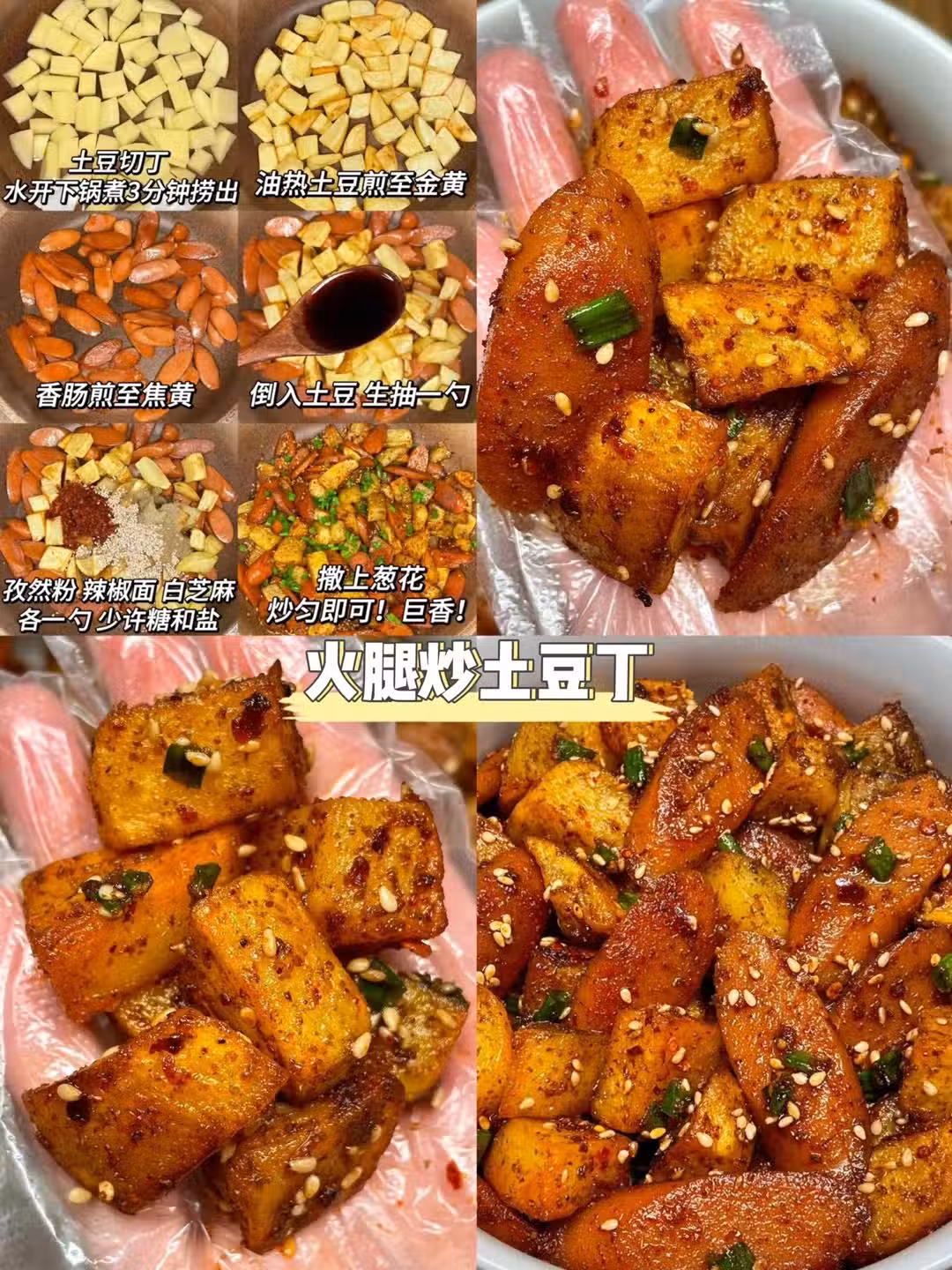 將土豆去皮切成小丁,火腿切成與土豆丁相似大小的丁。在開水中焯煮土豆丁至半熟撈出瀝干。鍋中加油燒熱,先下入火腿丁翻炒出香味,再加入土豆丁一起炒。此時可以適量加入鹽、黑胡椒粉等調味品,炒至土豆丁金黃、火腿丁口感適中即可。出鍋前撒上些許蔥花增色。