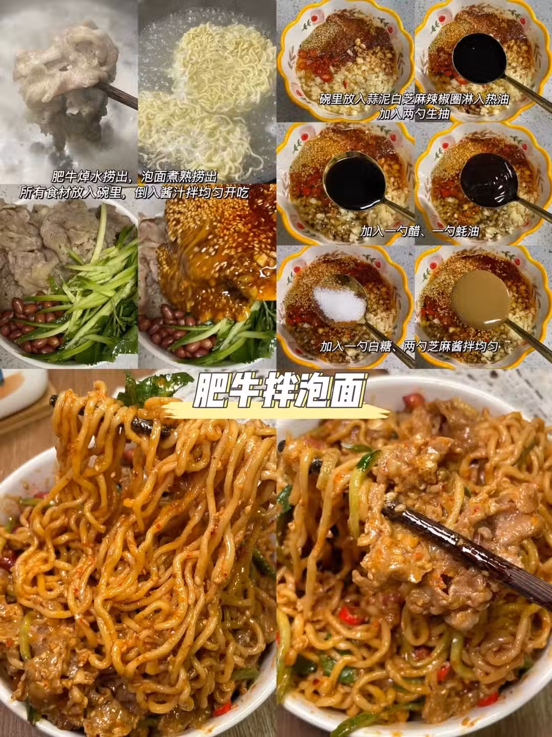 簡單快捷的肥牛拌泡麵是許多人喜愛的夜宵選擇。我們需要先將泡麵在開水中煮熟,撈出沖涼瀝干。肥牛片在沸水中快速燙熟,時間不宜過長,以免影響肥牛的嫩滑口感。泡麵和肥牛分別準備好後,接著準備調料,包括生抽、醋、蚝油、白糖和芝麻醬等。將調料均勻拌入泡麵和肥牛中,讓泡麵充分吸收調味,肥牛也會更加入味。