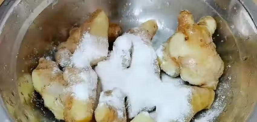 2.用精鹽搓洗一遍後,再把生薑放在流動水中沖洗兩遍。