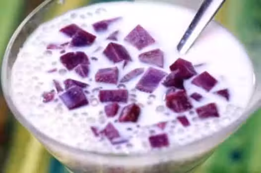 4.洗凈鍋倒入250克牛奶200克椰漿小火煮開後,倒入奶和西米的混合物煮開,倒入蒸熟的香芋和紫薯,邊加熱邊攪拌約5分鐘即可。