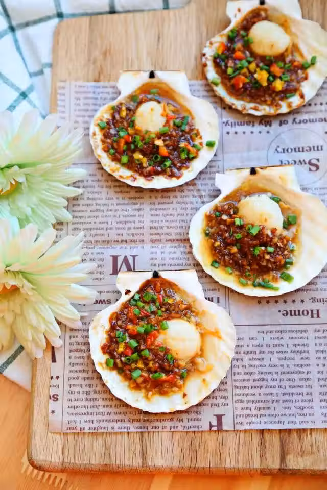 1.買回來的扇貝去掉內臟,用清水沖洗乾淨,用勺子把肉和扇貝殼分開,然後再把扇貝肉擺在殼上