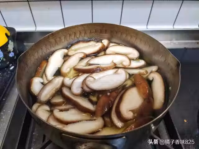 6、再加入香菇片和西蘭花片,因為已經煮熟了,就不需要再翻炒。