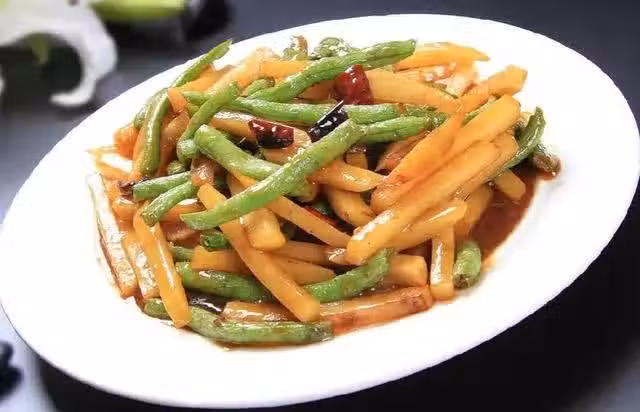 4、放豆角煸炒,放適量鹽,糖,十三香,再加入土豆,繼續煸炒即可。