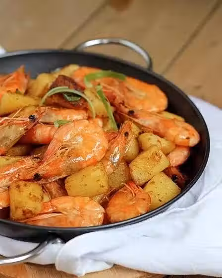 6、放入油炸好的土豆和蝦,調入適量生抽、鹽、雞粉大火炒均勻即可。