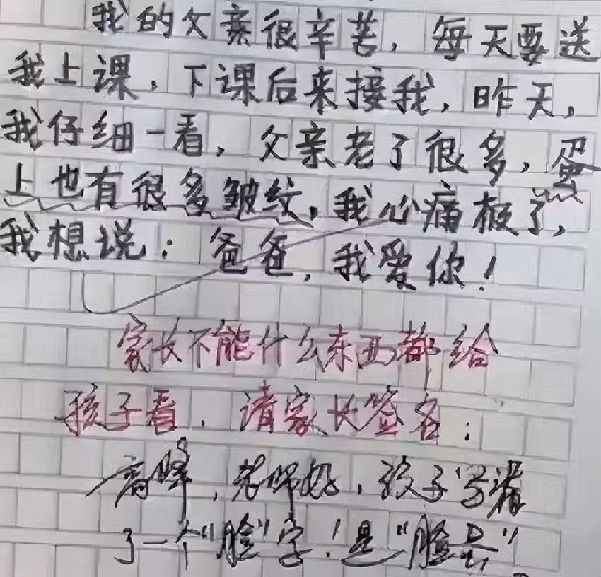 老師在看完作文之後寫上了評語:「家長不能什麼東西都給孩子看」。