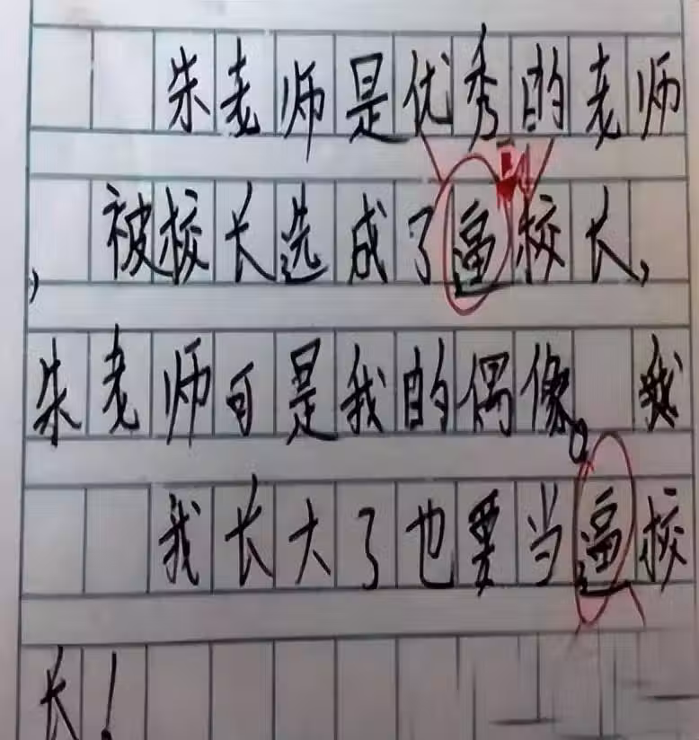 就比如說這篇小學生作文,小學生寫的是《優秀的朱老師》,原本是誇老師的作文。