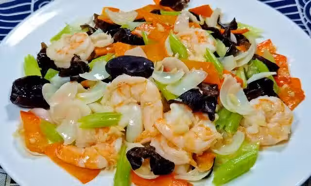 準備食材:鮮蝦仁、芹菜、鮮百合、姜、蔥、料酒、生抽、鹽、糖、澱粉、食用油。