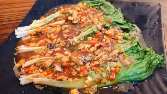 2. 鍋中放油,加入香菇、蚝油、生抽、鹽炒勻,加入適量的水澱粉勾芡,將湯汁澆在生菜上,即可食用。