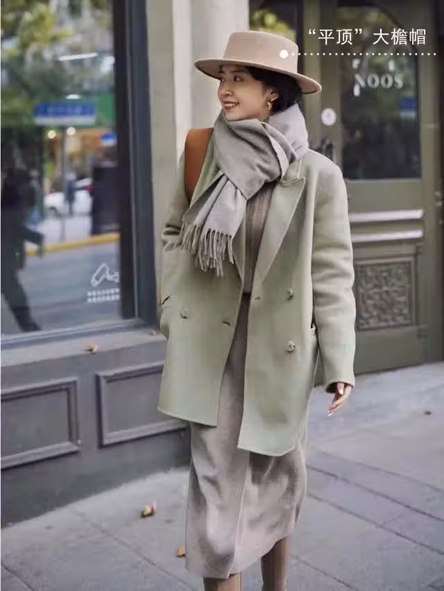 年齡大的女性,再穿衣打扮的時候,其實最忌諱的就是艷俗花哨,顯得俗氣不說,還會顯得廉價感十足。像這種低飽和度的彩色搭配上燕麥色,就會顯得造型非常溫柔時髦;比如豆沙綠大衣+燕麥色半裙,佩戴上同色系的帽子和圍巾更有氛圍感。