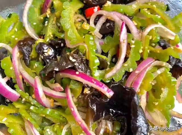 3、鍋里放水煮開放點油,苦瓜倒進去煮一分鐘左右撈出備用,木耳焯熟過下涼水後,和苦瓜洋蔥放到一起!淋入調好的醬汁拌勻即可!!可以拌好放一會更入味!!香到沒朋友!!減脂期也可放心吃!!