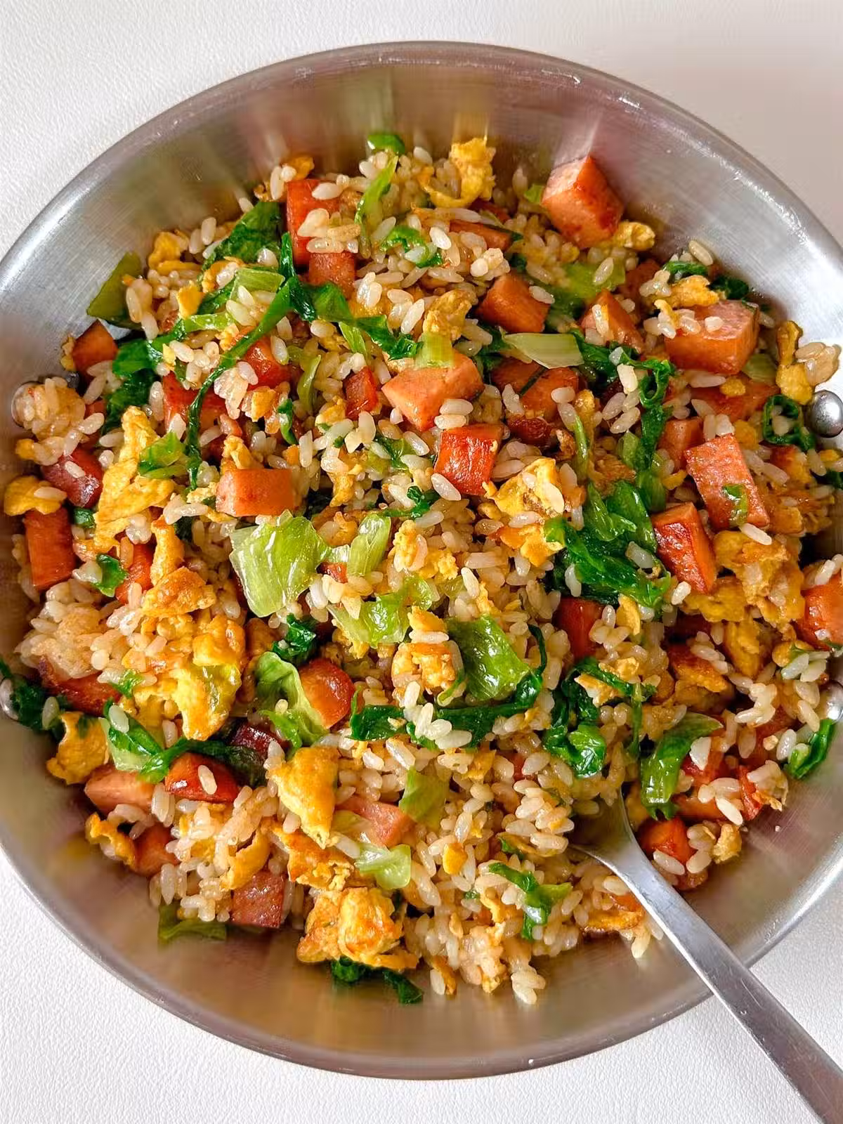 2、熱鍋燒油,下入午餐肉煎至兩面金黃,然後倒入炒好的雞蛋,加入一勺生抽,一勺蠔油,倒入適量的剩米飯翻炒均勻。