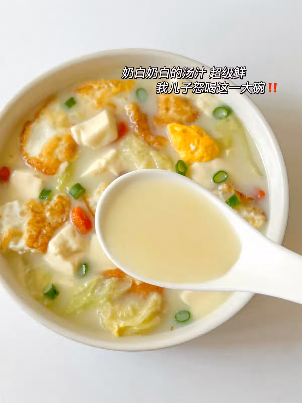 答應我一定要做這個白菜煎蛋豆腐湯!最近下雨天氣很冷,這個湯是寶寶點名要喝的!湯汁奶白、豆腐嫩滑、白菜鮮甜、還有吸飽湯汁的煎蛋,一口下去真的鮮掉眉毛~